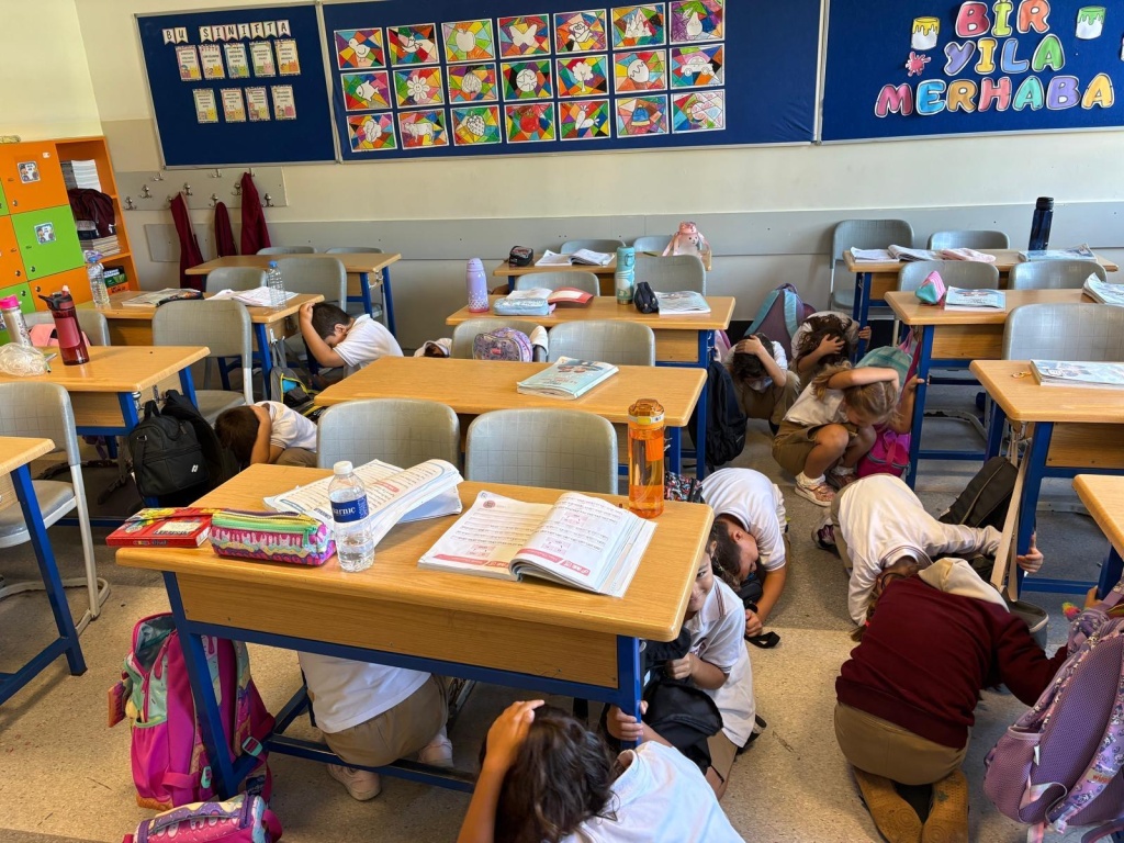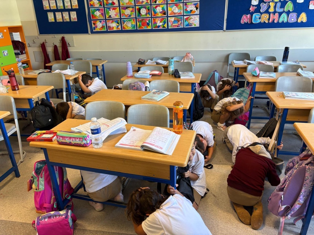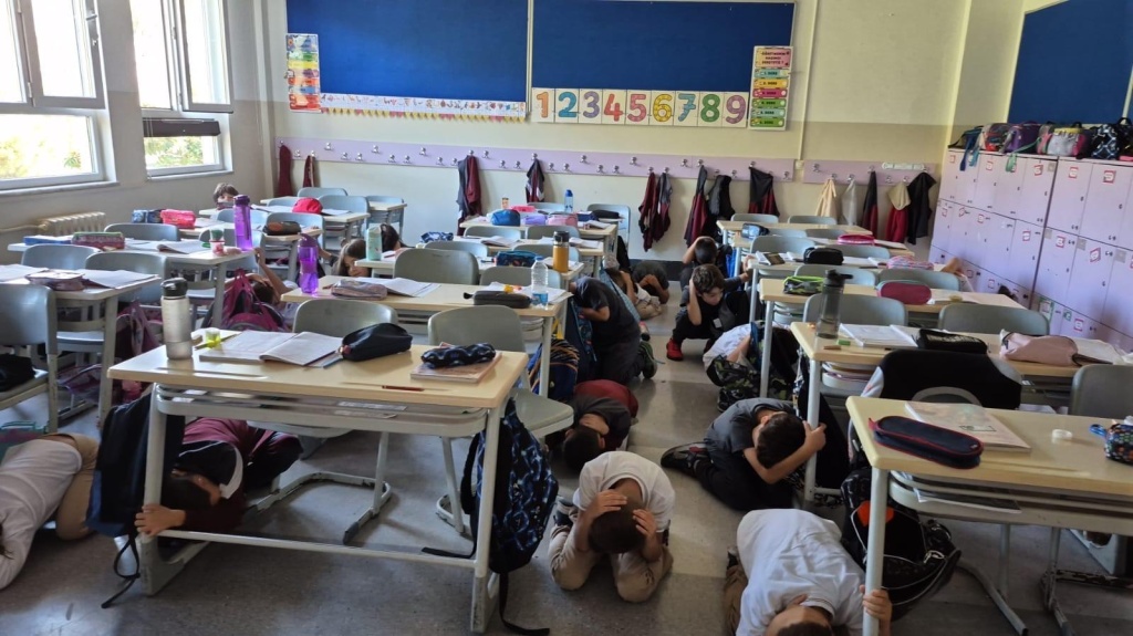 2025 Ulusal Düzey Tatbikatı kapsamında okulumuzda bilgilendirme videolarını izleme, "Çök-Kapan-Tutun" uygulaması ve tahliye tatbikatı yapılmıştır.